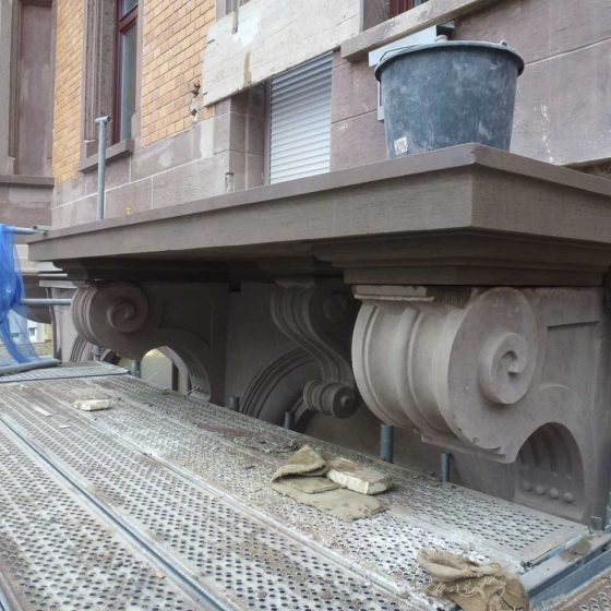 Wir übernehmen Aufgaben, wie den Einbau von Neuteilen aus Naturstein / Vierungen, Steinverfugungen und -festigungen, Steinreinigung der Fassade in verschiedenen Verfahren.